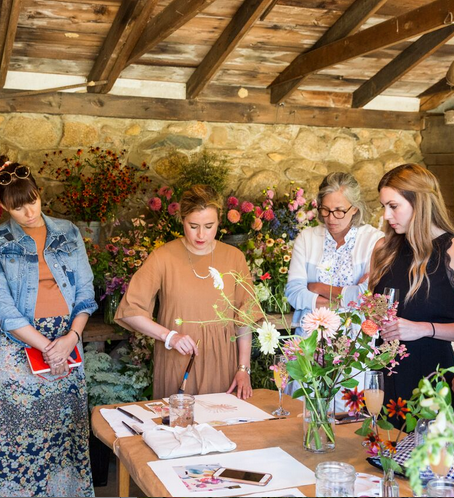Using the property’s stone barn as our bucolic workspace, Helen will lead students through a morning painting session where guests will learn to render an array of local flowers using watercolors and inks. Helen will elaborate on her painting techniques and approach to textile design in a way that can be enjoyed by both beginners or those accustomed to painting. Lunch from the Island's bountiful natural pantry, will be served among the flower fields. In the afternoon, students will build upon their gained floral sensitivities and compose their own arrangement, guided by Nicolette, who will showcase the best blooms of the season by working with an abundance of product grown directly at Tea Lane farm: Dahlias, Zinnias, Foglove, Cosmos, Queen Anne's Lace, Scabiosa, Honeysuckle, Hydrangea, Sweet Peas, Asclepias, Lisianthks, Double Lilies, Rudbeckia, Veronica -- truly an overwhelming amount of annuals and perennials, the list goes on! Tea Lane's open-air studio inspires creativity with views from its hilltop perch of the surrounding croplands, green pastures, and grazing sheep.